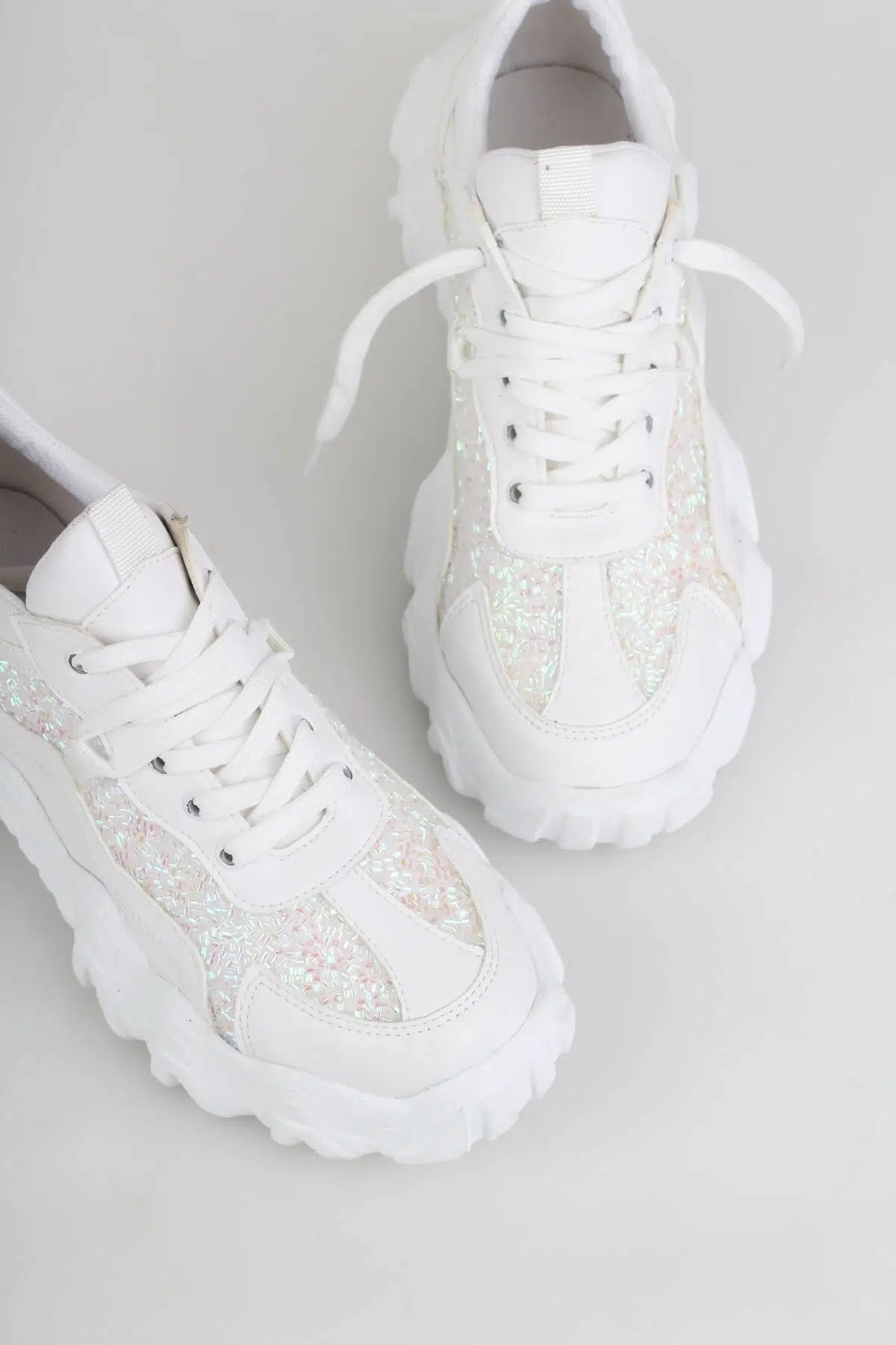 Beyaz Pul Taşlı Sneaker Kalın Tabanlı Kadın Spor Ayakkabı - Glen
