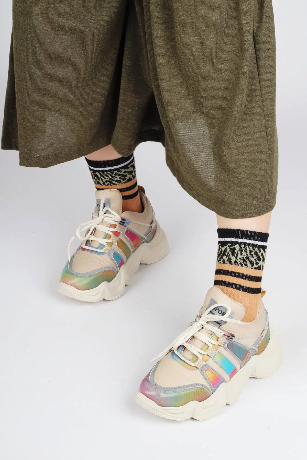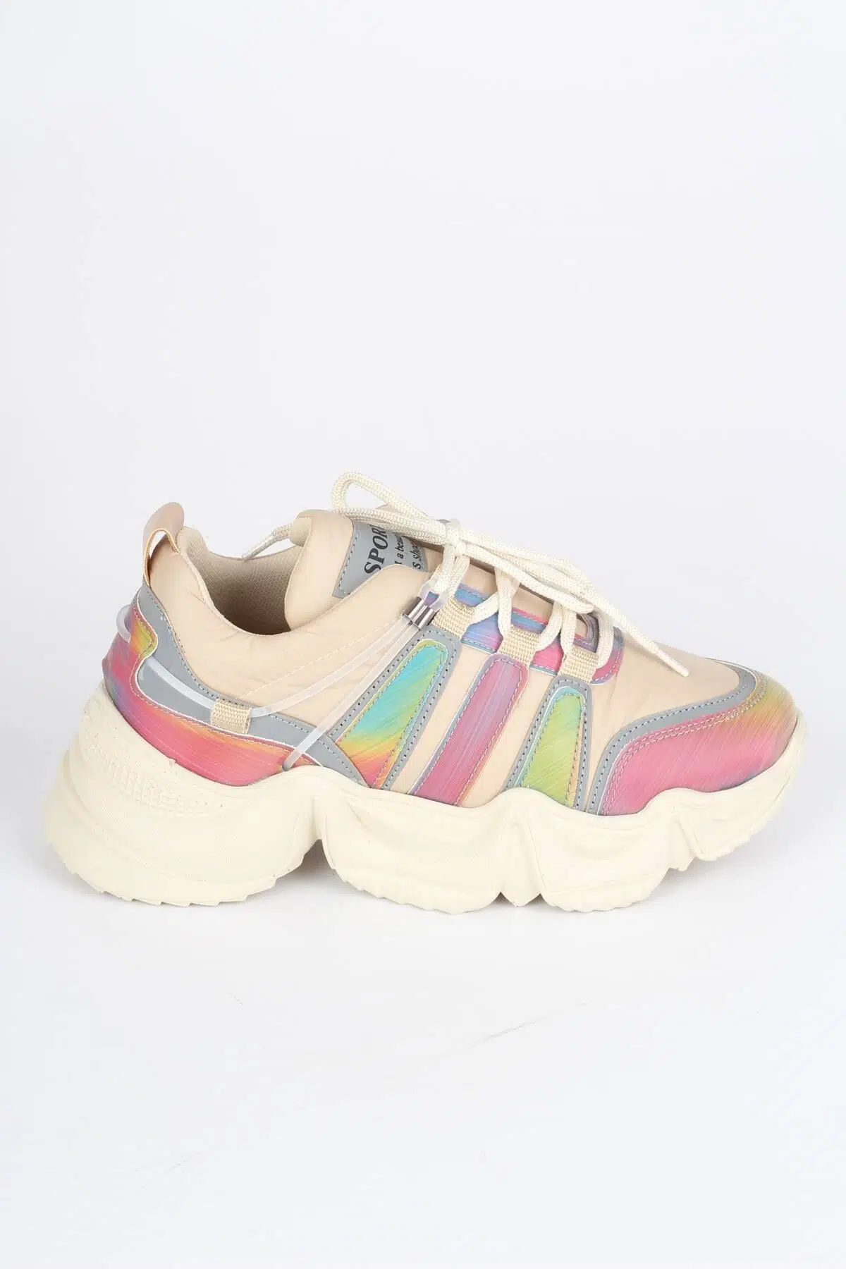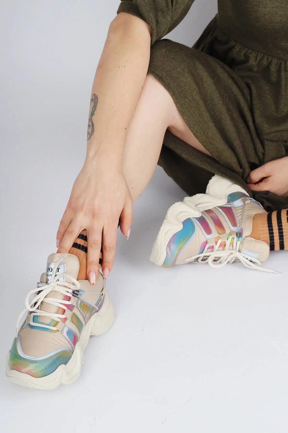 Çok Renkli Hologram Sneaker Kadın Bej Spor Ayakkabı - Colorful Moon