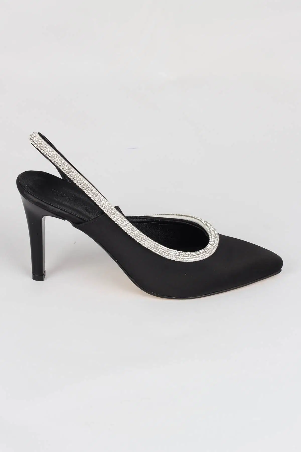 Gümüş Taşlı Siyah Saten Stiletto Topuklu Ayakkabı - Sial