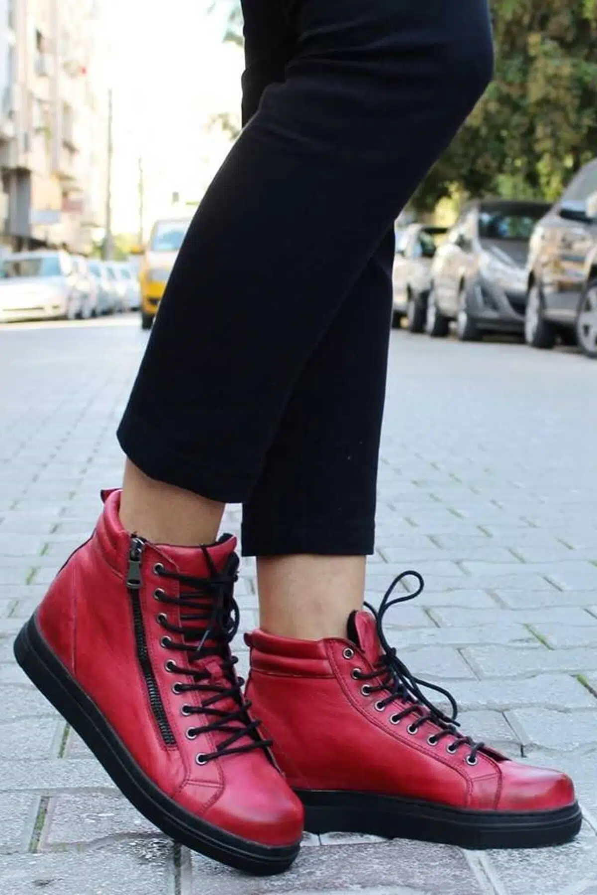 Hakiki Deri Günlük Fermuarlı Kısa Spor Bayan Bot Bordo - Maria