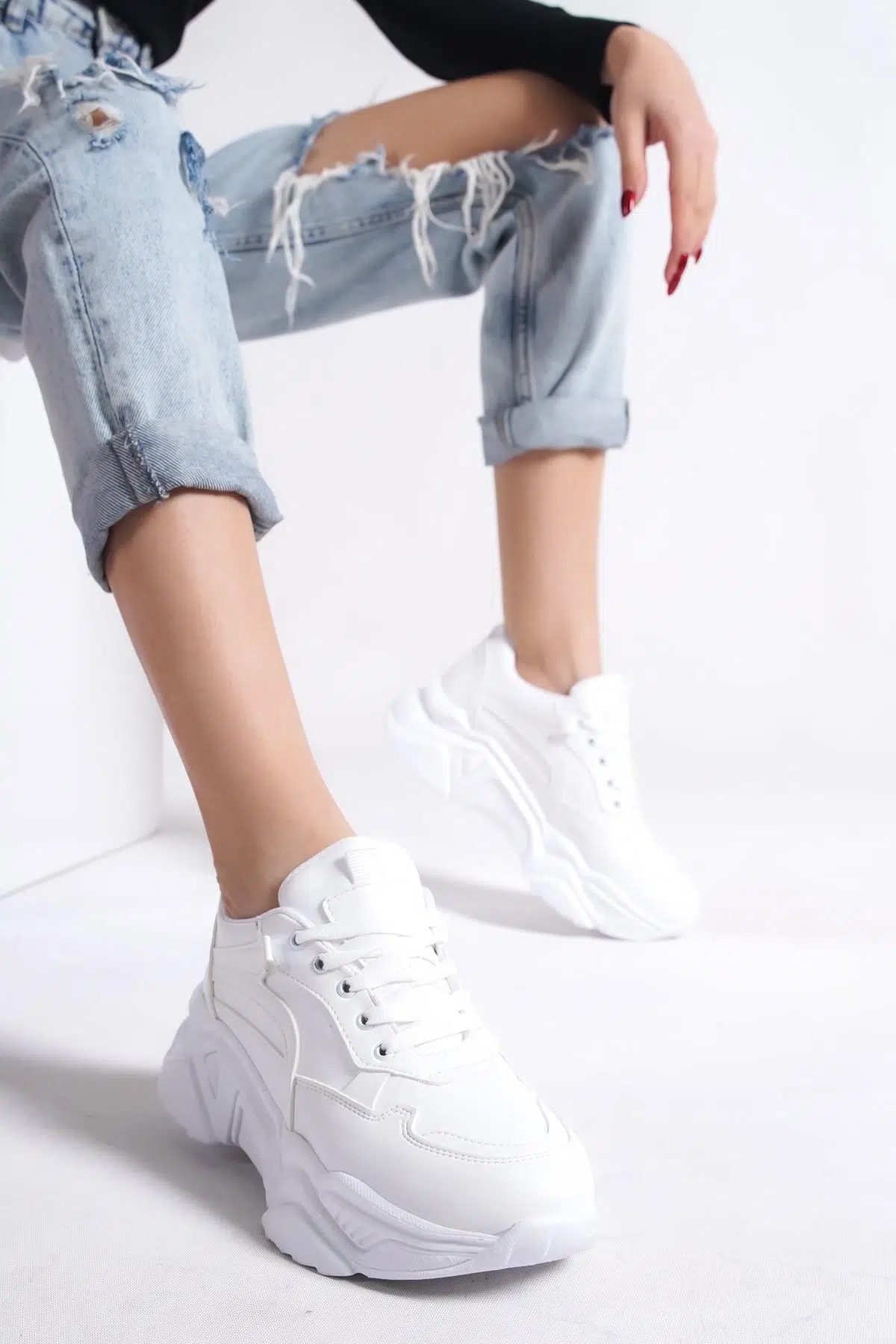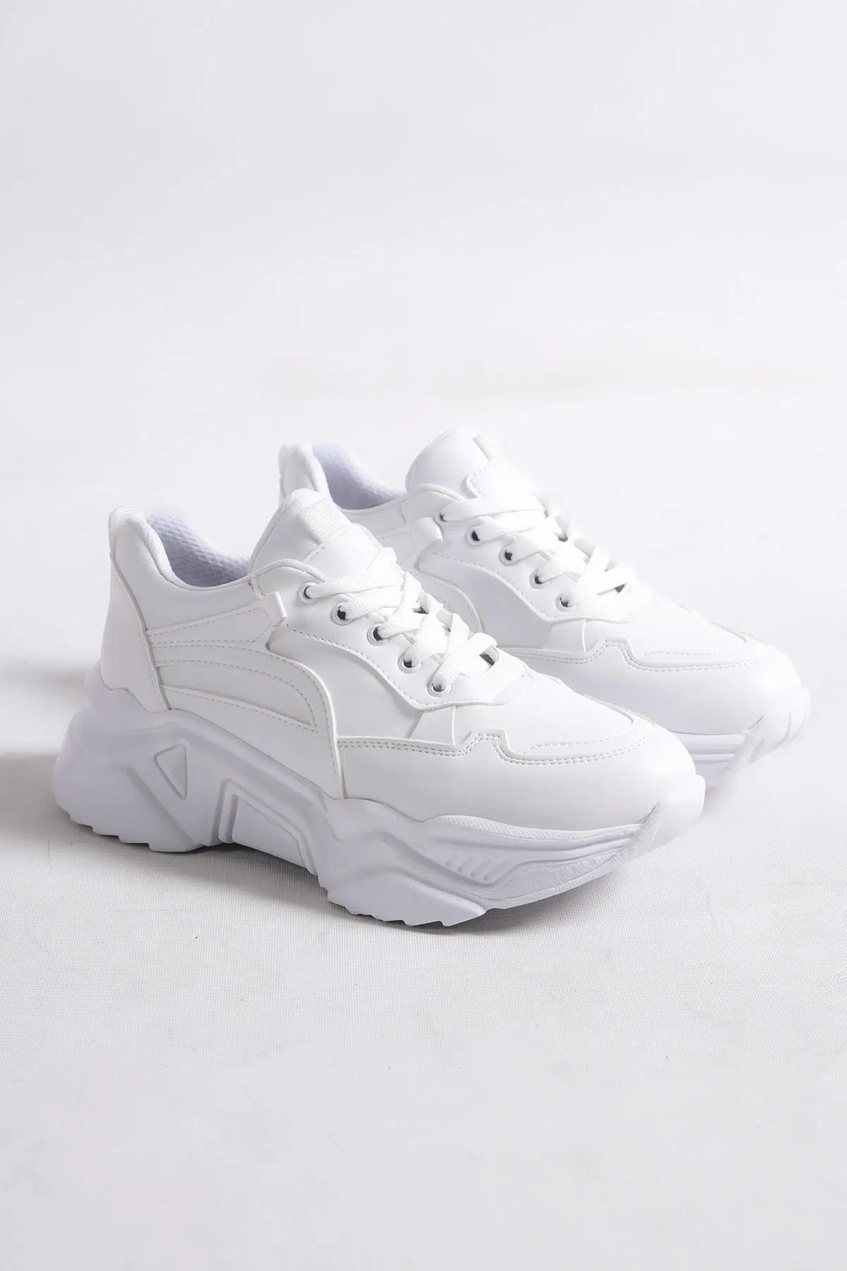 Kadın Kalın Tabanlı Düz Beyaz Sneaker Spor Ayakkabı - Fashi