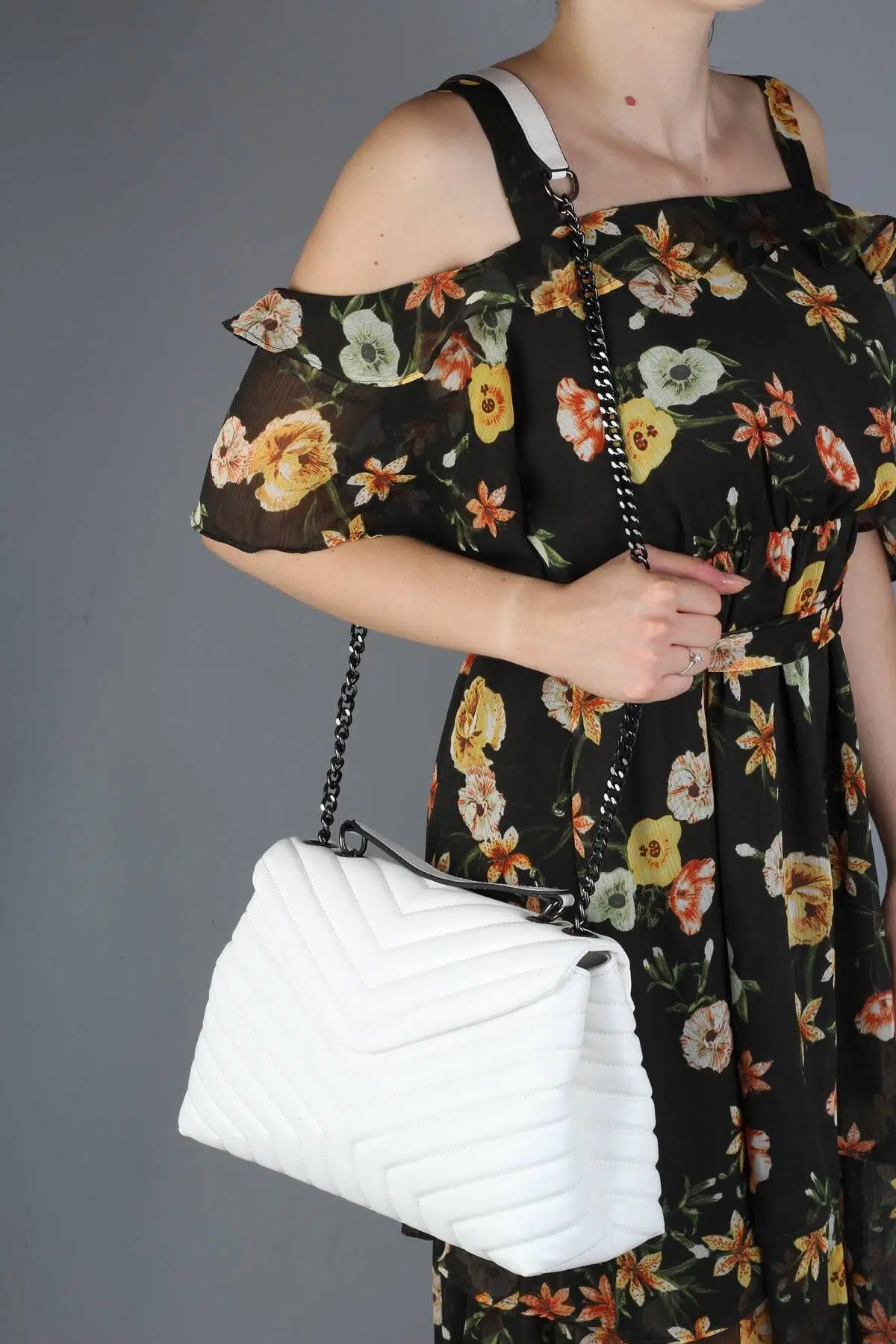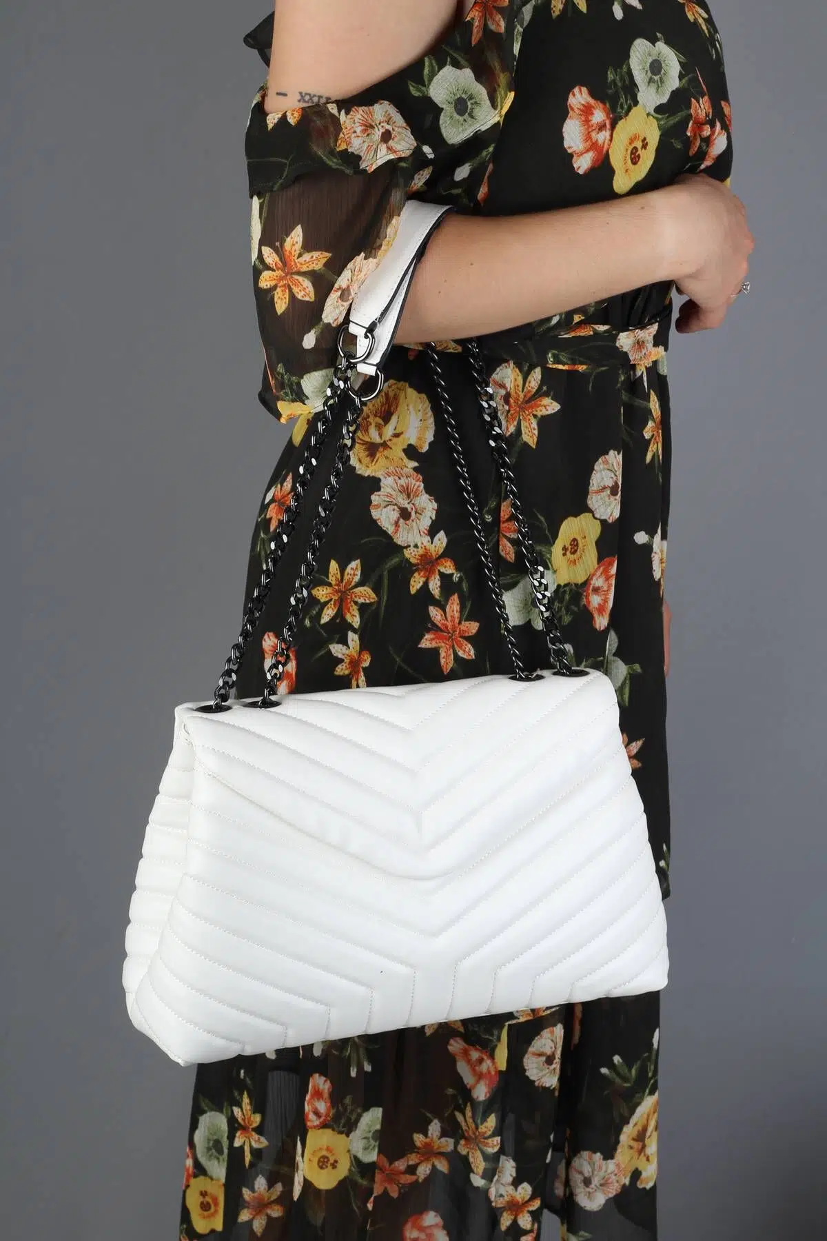 Beyaz üzerine yapılan şişme dikişler çantayı daha şık bir hale getiriyor.