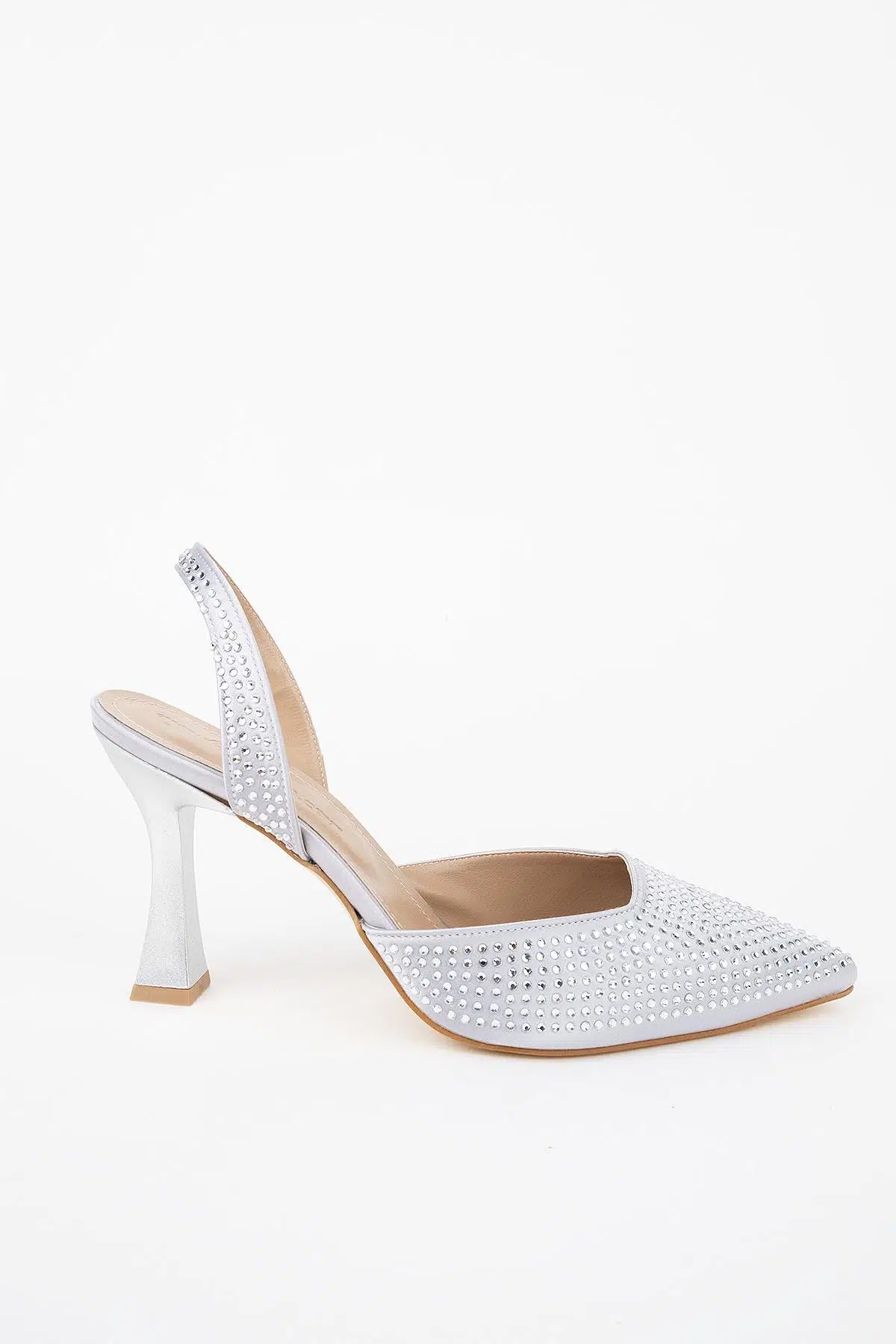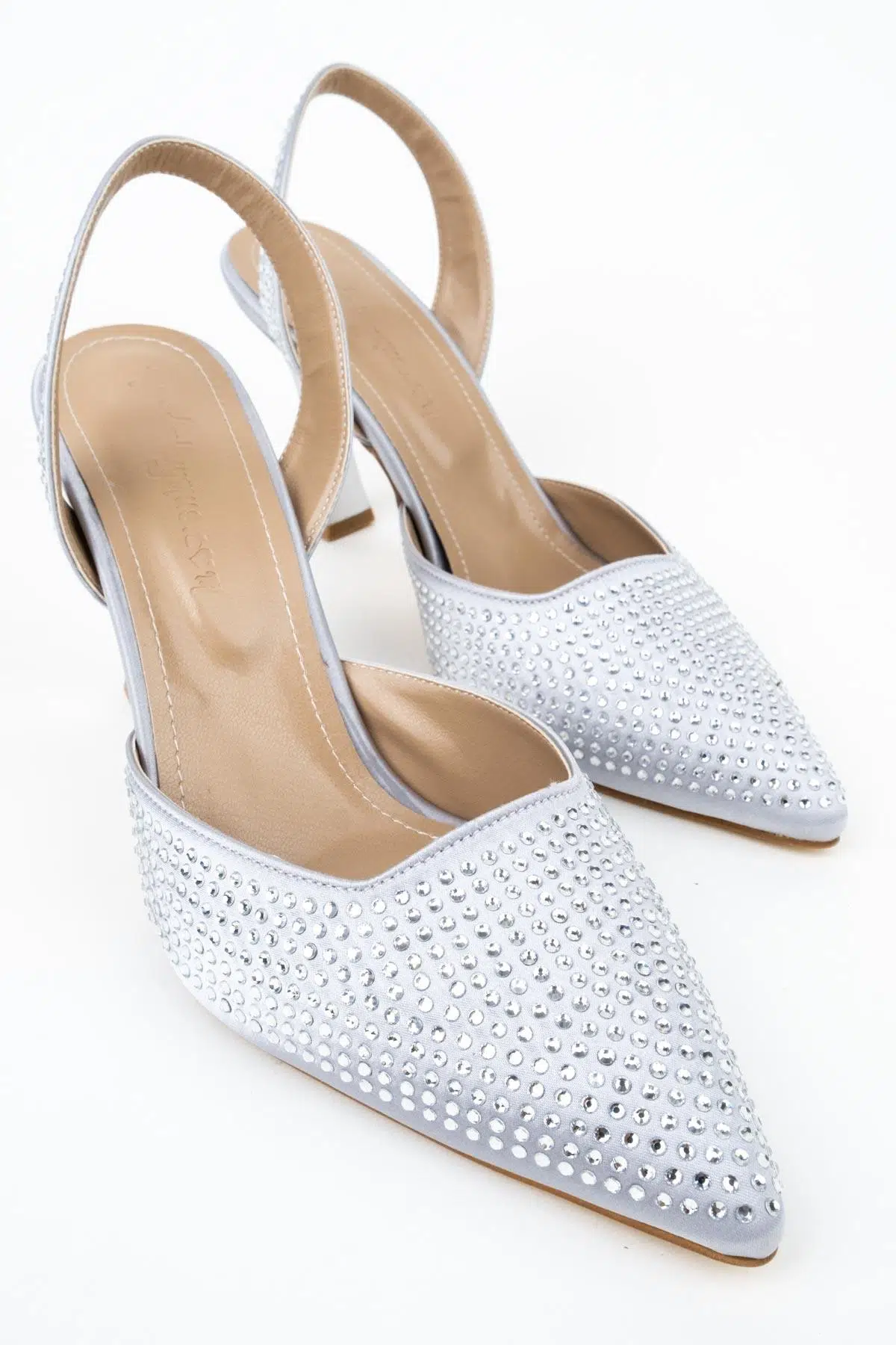 Pino Gri Saten Taşlı Stiletto Kadeh Topuklu Abiye Ayakkabı