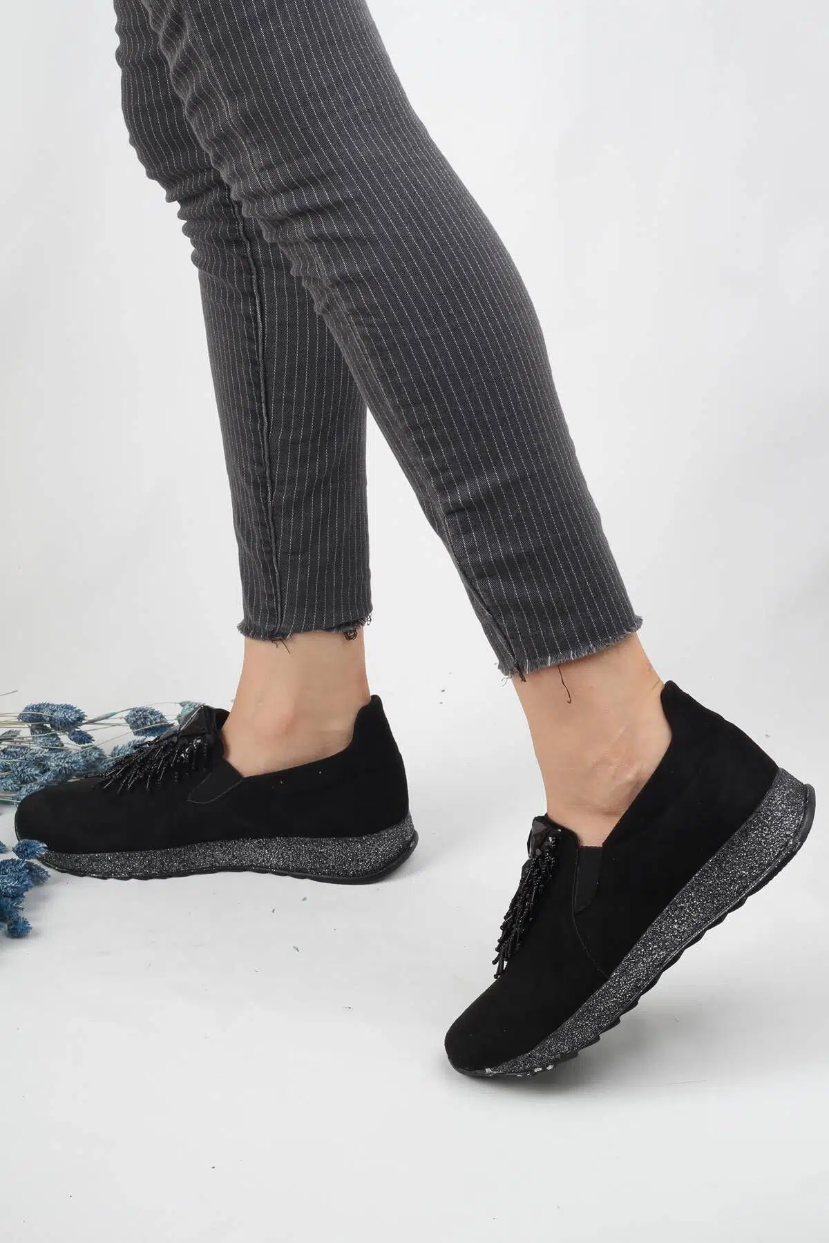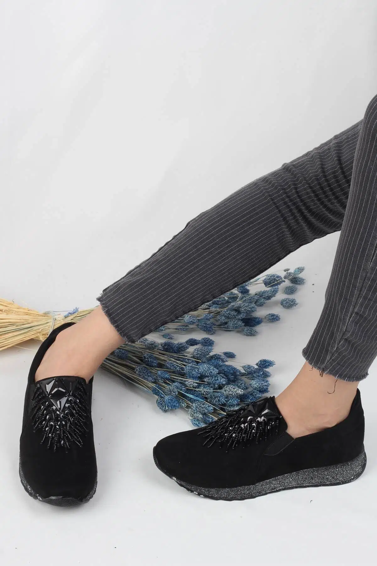 Siyah Süet Taşlı Kadın Spor Ayakkabı - Spunstar
